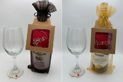 An elegant combination! This set includes a personalized wine glass tag, a satin bag in either gold or black, and a windowed gift bag. Name tag easily clips to a bow created with the bag's handles.